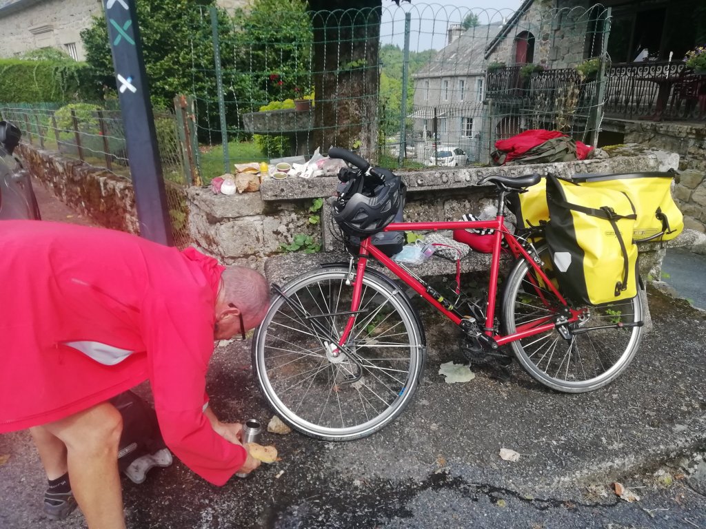Nous traversons toujours de jolis hameaux où nous constatons pour notre plus grand plaisir que le commerce local survit. En rangeant nos courses, dans les sacoches, un pot de confiture s’est ouvert. Le nettoyage s’impose…