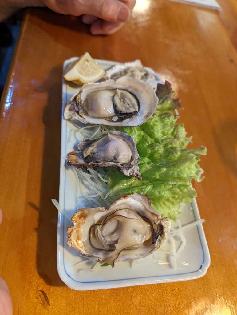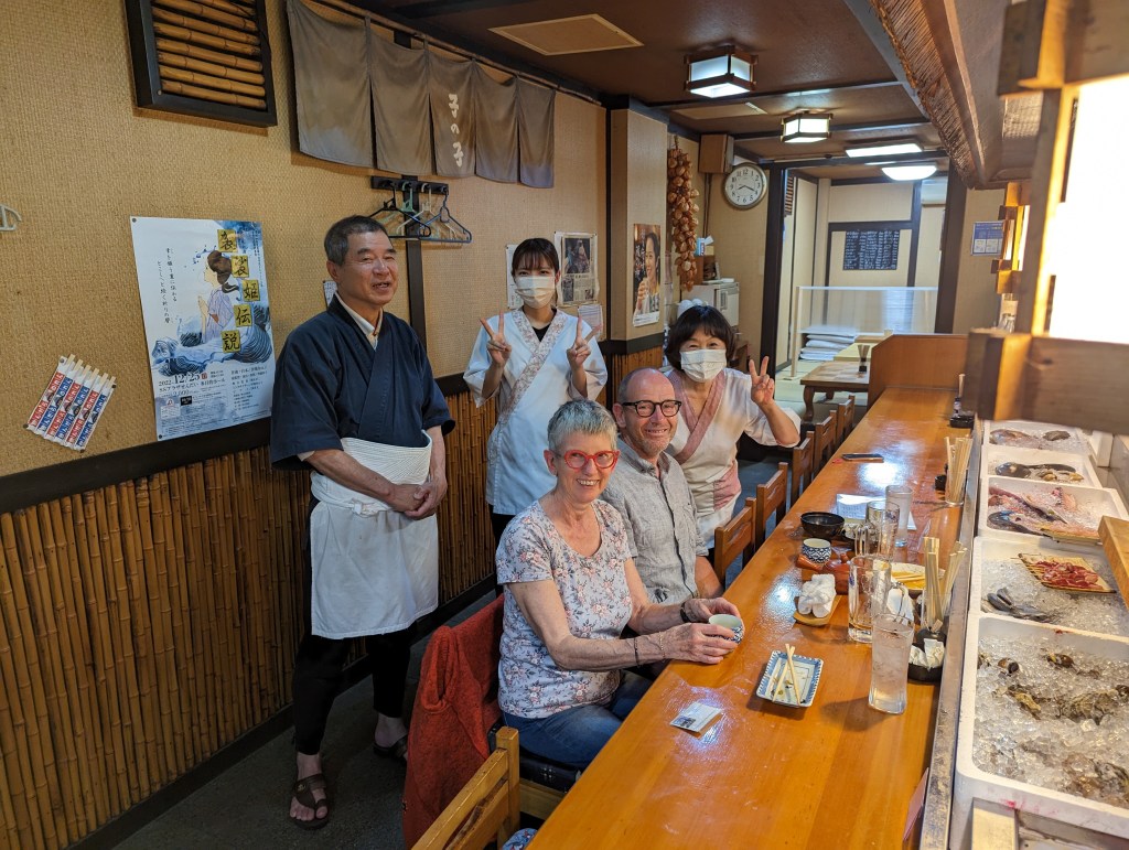 Nous faisons étape à Satsuma Sendai. Au hasard, nous poussons la porte de ce petit restaurant. Nous ne serons pas déçus. Les poissons sont exposés sur le comptoir, c’est pratique pour faire son choix. C’est délicieux! Nous félicitons le cuisinier. La conversation s’engage et se termine dans la bonne humeur avec les autres clients, sans qu’on comprenne bien ce qui se dit !