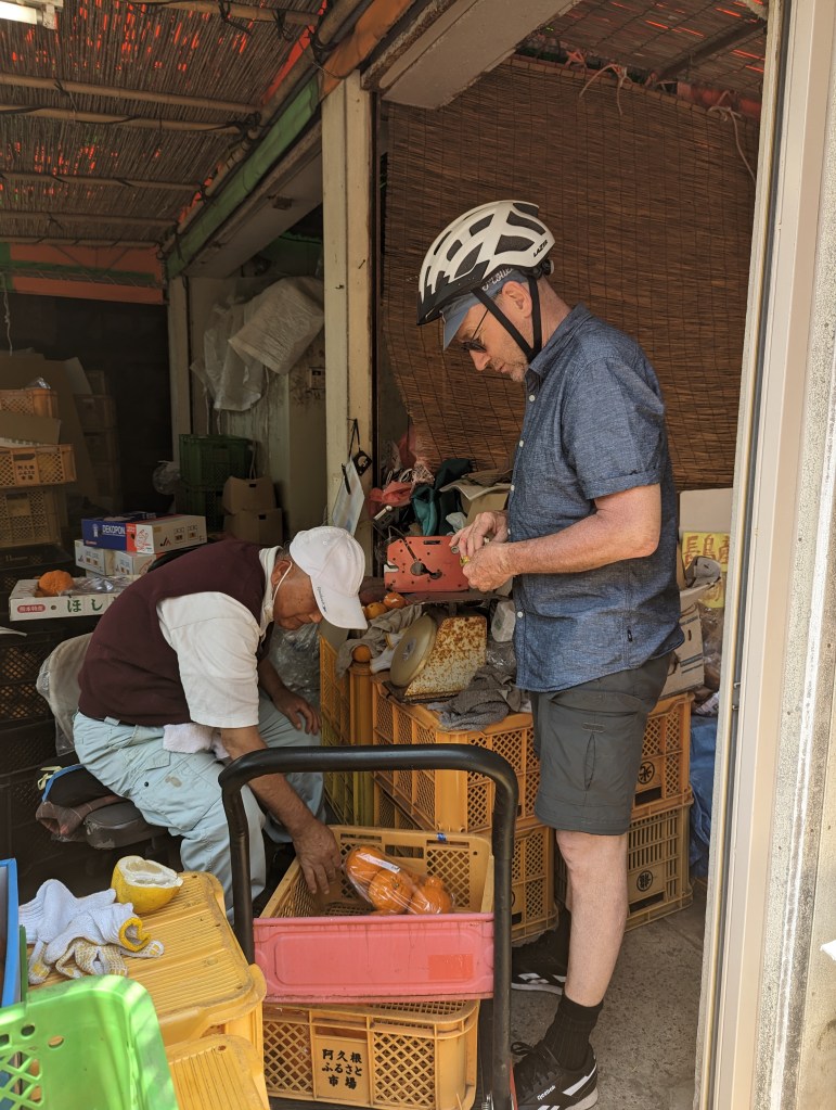 Nouvel arrêt un peu plus loin. Derrière un stand on devine un étalage de fruits et légumes parmi lesquels se trouvent les fameuses « mikan », les mandarines japonaises. Le vendeur nous en fait goûter un quartier. C’est délicieux ! Le problème c’est qu’il ne les vend qu’en gros filets. Nous lui en demandons deux, qu’il nous offre. Pas moyen de payer.