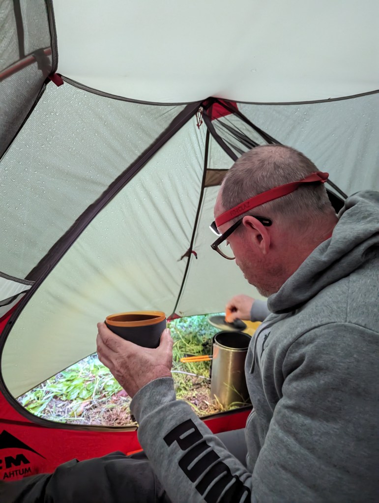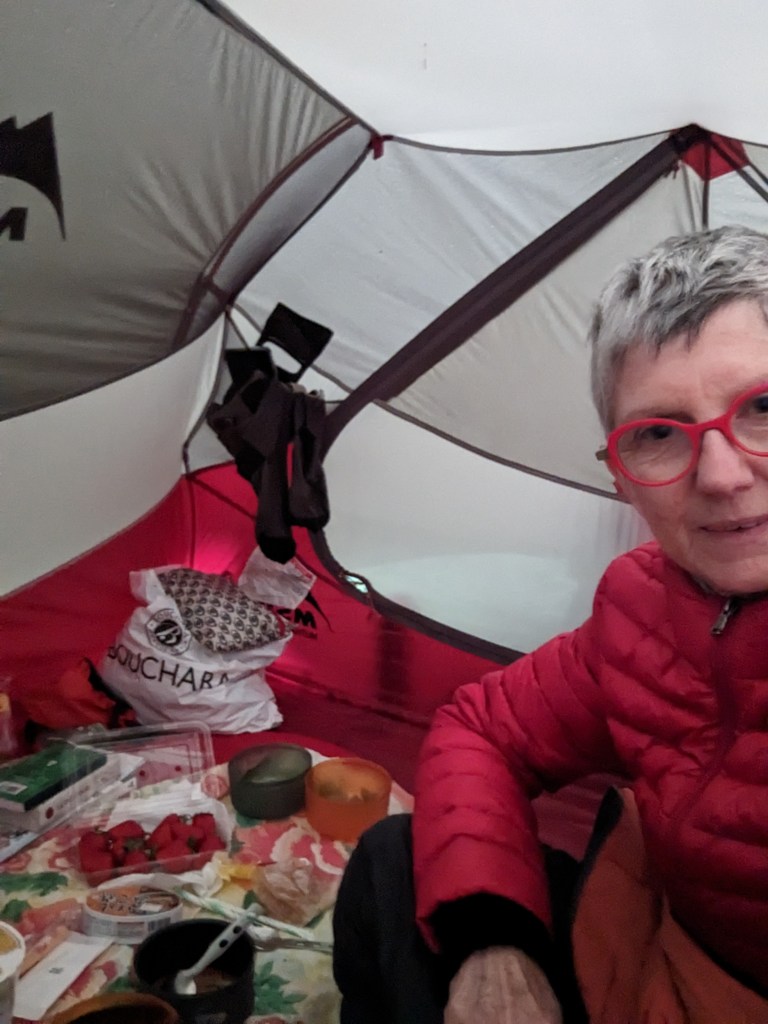 Au retour de la plage sous le soleil, je vois que le voyage se poursuit avec allégresse, le tout accompagné de belles rencontres et de repas élaborés. Enfin, une vue de la tente ( une nouvelle non ?) et sous la pluie…du vrai camping sauvage !