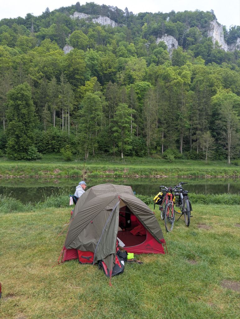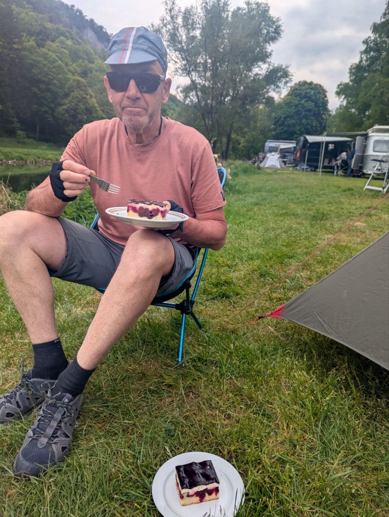En fin d’après-midi nous arrivons dans un petit camping où chacun s’installe comme il peut. Nous sommes un peu collés contre les voisins, ce que la photo ne montre pas… Mais notre voisin le plus proche ne nous en tient pas rigueur puisqu’il nous offre une part de gâteau. Deuxième « stück » de Schwarzwaldkuchen dans l’après midi pour Catherine !