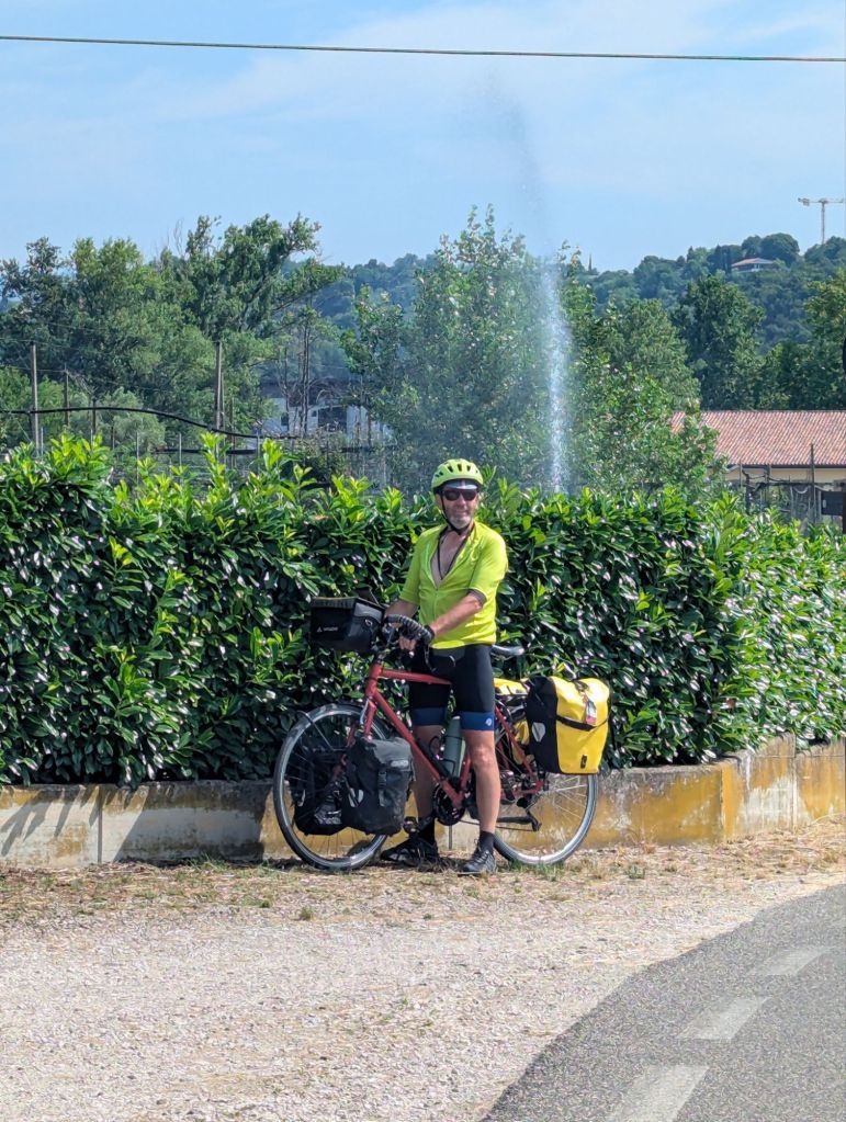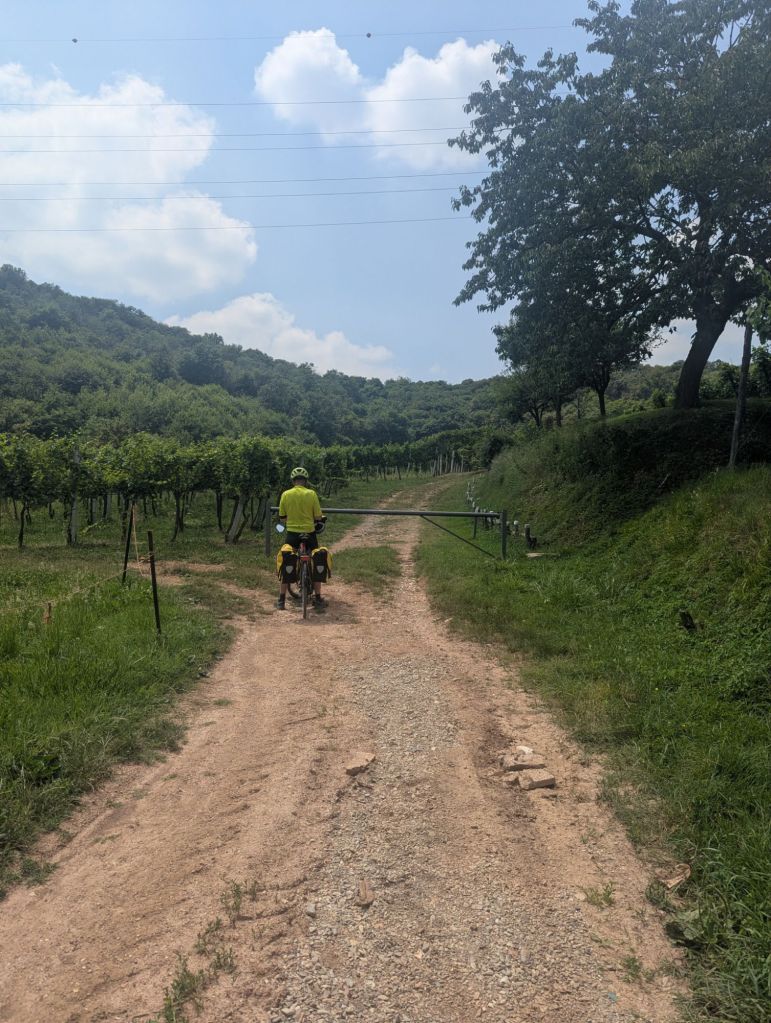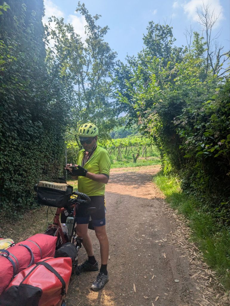 Nous avions décidé d’aller dans un petit camping dans la montagne. Nous savions que ça devait grimper. Mais l’application Komoot nous a emmenés dans un dédale de chemins caillouteux très pentus et qui se termine dans les vignes. Demi-tour !